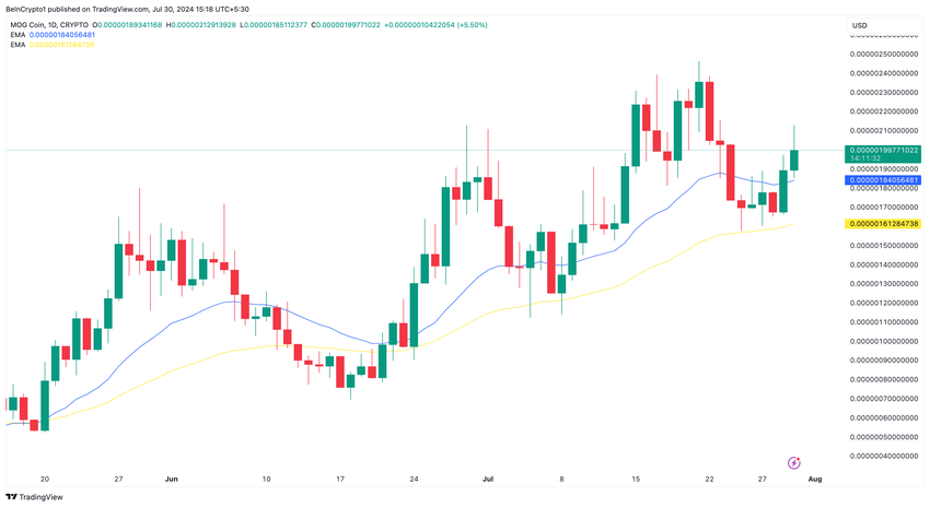 ปัจจุบัน เหรียญมีมลดลง 17% จาก ATH แต่เพิ่มขึ้น 6.98% ในช่วง 24 ชั่วโมงที่ผ่านมา อย่างไรก็ตาม ค่าเฉลี่ยเคลื่อนที่แบบเอ็กซ์โพเนนเชียล (EMA) แสดงให้เห็นว่าราคาของ MOG อาจพุ่งสูงขึ้นต่อไปในเดือนสิงหาคม