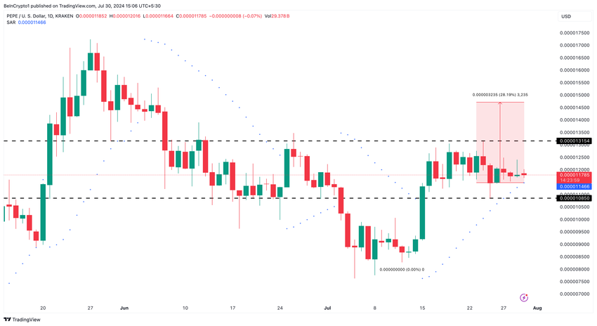 อย่างไรก็ตาม สิ่งนี้อาจเปลี่ยนแปลงได้ในเดือนสิงหาคม โดยเฉพาะอย่างยิ่งเนื่องจาก PEPE เป็นเหรียญมีมอันดับต้น ๆ บนบล็อกเชน Ethereum จากมุมมองทางเทคนิค โทเค็นมีการซื้อขายระหว่างจุดต่ําสุดที่ 0.000010 ดอลลาร์และจุดสูงสุดที่ 0.000013 ดอลลาร์ในช่วงสองสัปดาห์ที่ผ่านมา