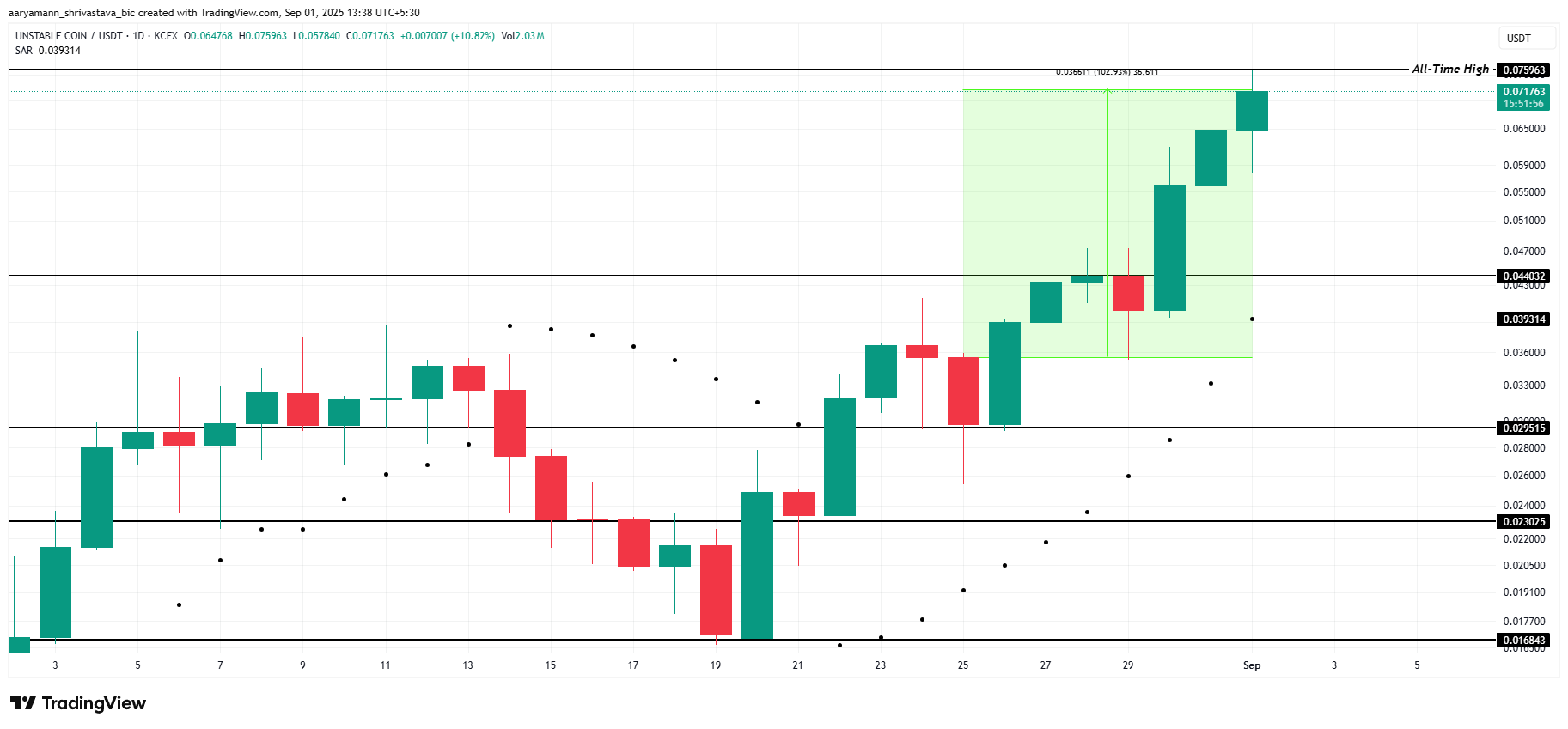 USDUC พุ่งขึ้นเกือบ 103% ในสัปดาห์ที่ผ่านมา ทำสถิติสูงสุดใหม่ที่ 0.075 USD ขณะที่เขียนนี้ memecoin ซื้อขายต่ำลงเล็กน้อยที่ 0.071 USD การขึ้นที่แข็งแกร่งนี้ทำให้ USDUC อยู่ในกลุ่มโทเคนที่มีผลงานดีที่สุดในตลาดในช่วงขาขึ้นล่าสุด