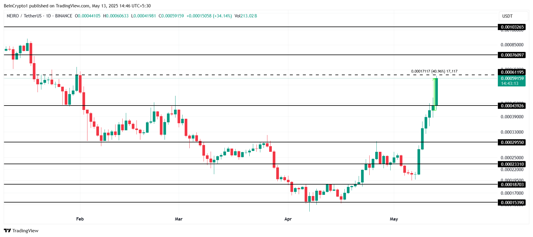 NEIRO มีการพุ่งขึ้น 41% กลายเป็นหนึ่งใน memecoins ที่มีผลงานดีที่สุดในวันนี้ ปัจจุบันซื้อขายที่ $0.000591 altcoin กำลังเข้าใกล้ระดับแนวต้านที่สำคัญ ซึ่งเป็นอุปสรรคสำคัญที่ NEIRO เคยเผชิญในอดีต โดยเฉพาะในช่วงทดสอบใหม่ในเดือนกุมภาพันธ์