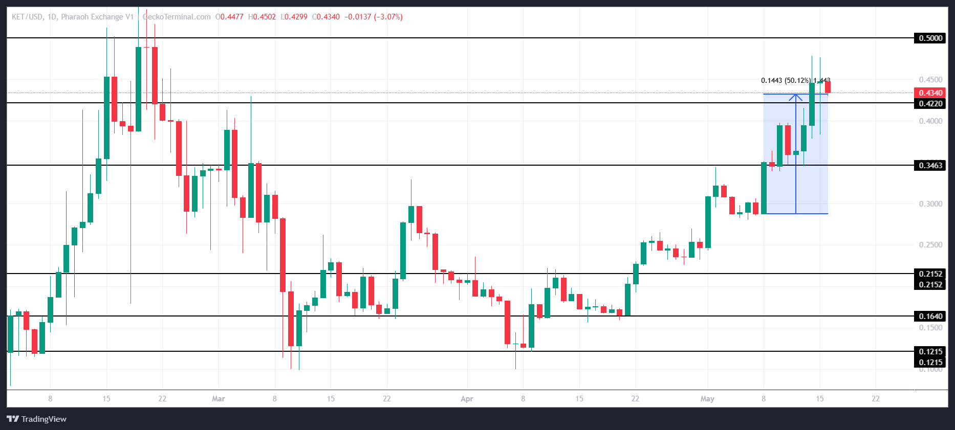 ราคาของ KET พุ่งขึ้น 50% ในเก้าวัน แตะที่ 0.43 USD แนวโน้มขาขึ้นนี้ในเดือนครึ่งช่วยให้ memecoin ฟื้นตัวจากการขาดทุนในเดือนกุมภาพันธ์ ซึ่งแสดงถึงความเชื่อมั่นของนักลงทุนที่กลับมาในศักยภาพการฟื้นตัวของมัน