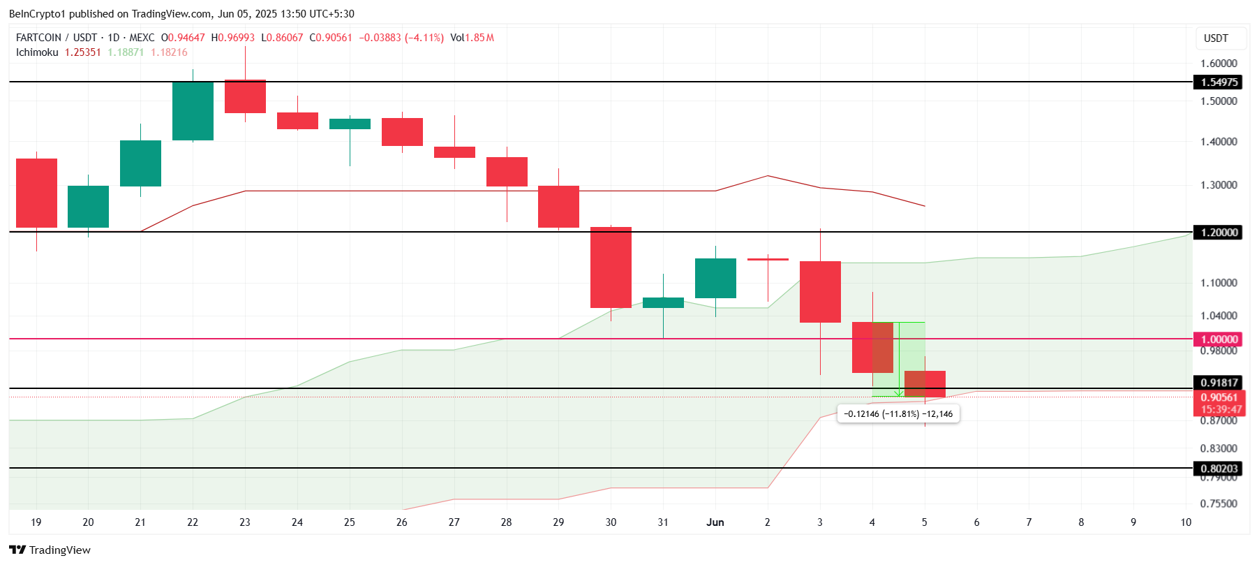 Ichimoku Cloud ชี้ให้เห็นถึงแนวโน้มขาลงเนื่องจากยังไม่เคลื่อนที่เหนือแท่งเทียน อย่างไรก็ตาม นี่ก็แสดงให้เห็นว่า FARTCOIN อาจมีพื้นที่สำหรับการฟื้นตัวหากสามารถยึด 1.00 USD เป็นการสนับสนุนได้ การสะสมราคาต่ำอาจเป็นกุญแจสำคัญในการช่วยให้ memecoin มีเสถียรภาพและเพิ่มขึ้น