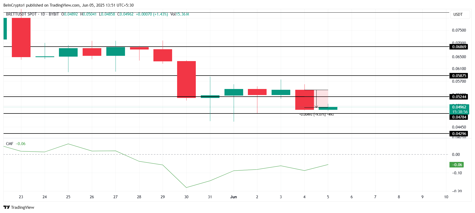 Chaikin Money Flow (CMF) กำลังแสดงการเพิ่มขึ้น ซึ่งบ่งชี้ว่าการไหลเข้ากำลังแข็งแกร่งขึ้น หาก CMF พลิกกลับเหนือเส้นศูนย์และยืนยันแรงกระตุ้นขาขึ้น BRETT อาจฟื้นตัวจากแนวรับที่ 0.047 USD และมุ่งสู่การฟื้นตัว โดยอาจดันไปที่ 0.052 USD และมากกว่านั้น