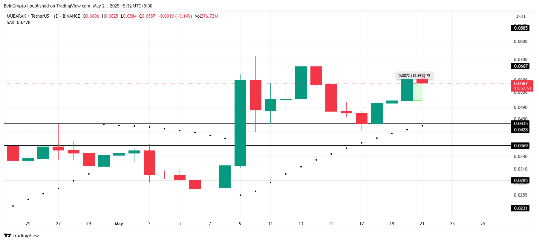 ราคาของ MUBARAK เพิ่มขึ้น 14% ในช่วง 24 ชั่วโมงที่ผ่านมา กำลังเตรียมตัวเพื่อทะลุแนวต้านสำคัญที่ 0.0667 USD ตัวบ่งชี้ Parabolic SAR ที่อยู่ใต้แท่งเทียนให้มุมมองที่เป็นบวกสำหรับ memecoin นี้ โดยบ่งชี้ว่าแรงขาขึ้นอาจดำเนินต่อไปเมื่อเข้าใกล้แนวต้านสำคัญ
