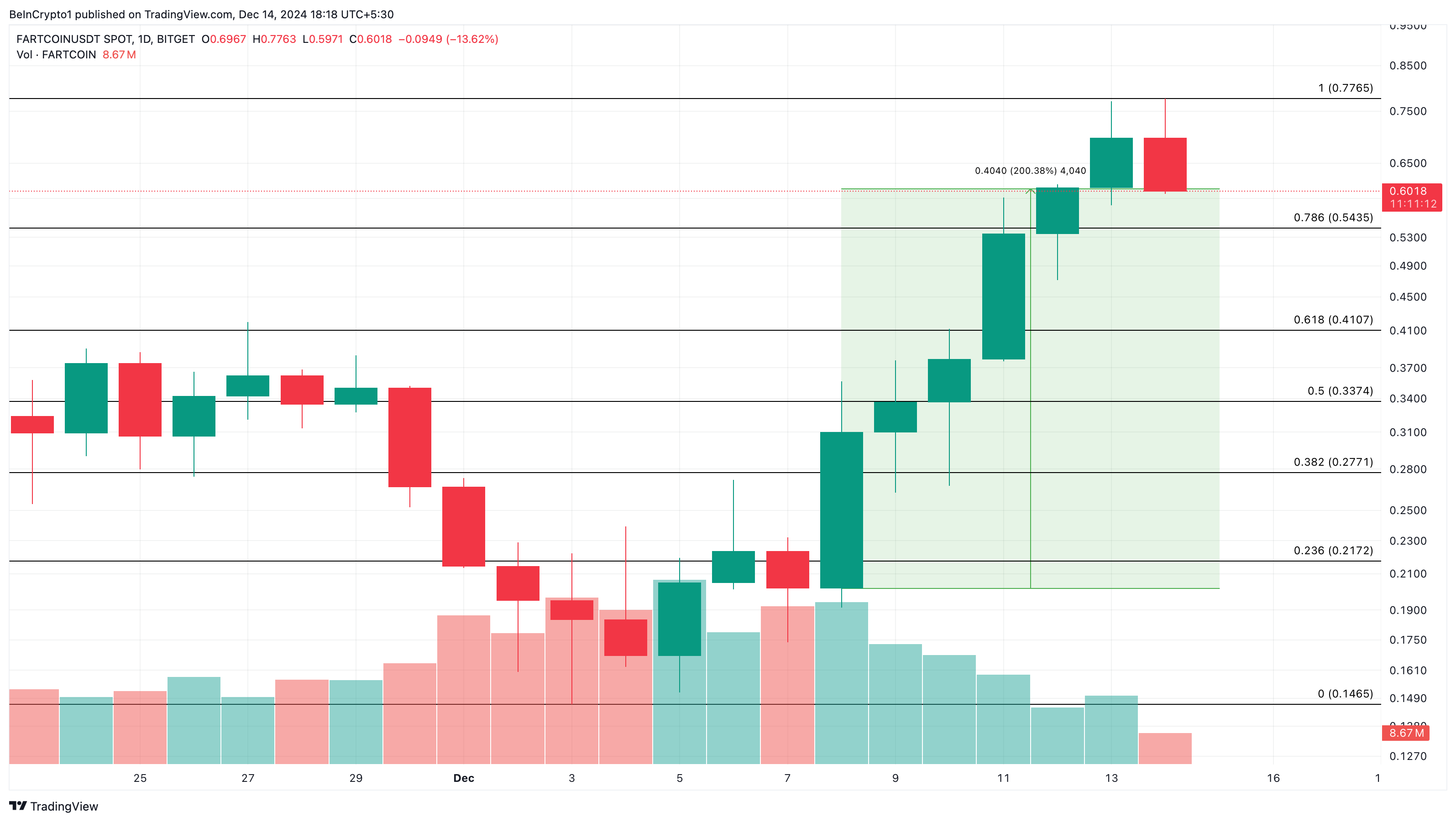 ในขณะที่ memecoins อย่าง DOGE และ WIF ประสบกับการลดลง Fartcoin ซึ่งเพิ่งได้รับความสนใจจากตลาด กลับพุ่งขึ้น ตามกราฟรายวัน ราคาของ FARTCOIN เพิ่มขึ้น 200% ระหว่างวันที่ 8 ธันวาคมจนถึงเวลาที่เขียน