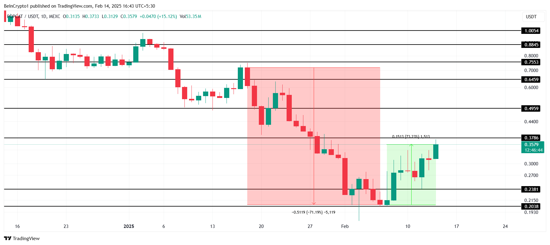 ราคา POPCAT พุ่งขึ้น 73% ซื้อขายที่ 0.35 USD ตามการอัปเดตล่าสุด โดดเด่นเป็นหนึ่งใน memecoins ที่มีผลงานดีที่สุด POPCAT สามารถฟื้นตัวเกือบครึ่งหนึ่งจากการลดลง 71% ที่สังเกตได้ระหว่างเดือนมกราคมถึงกุมภาพันธ์ แสดงถึงศักยภาพในการเติบโตต่อไปเมื่อโมเมนตัมเพิ่มขึ้น