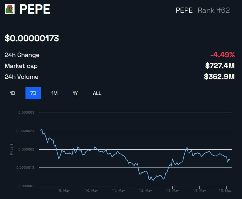 ราคาของ PEPE พุ่งขึ้นจากระดับสูงสุดตลอดกาลที่ 0.00000431 ดอลลาร์สหรัฐฯ ในวันที่ 5 พฤษภาคม อย่างไรก็ตาม นับตั้งแต่นั้นเป็นต้นมา มีการเทขา PEPE มากกว่า 60% ในราคาปัจจุบันที่ 0.00000172 ดอลลาร์สหรัฐฯ