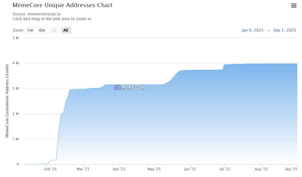 แม้จะมีอุปสรรคเหล่านี้ แต่ก็มีสัญญาณว่า MemeCore กำลังสร้างฐานสนับสนุนที่มั่นคง ตั้งแต่ต้นปี มีที่อยู่ที่ไม่ซ้ำกันเกือบ 4 ล้านที่ได้มีปฏิสัมพันธ์กับเครือข่าย