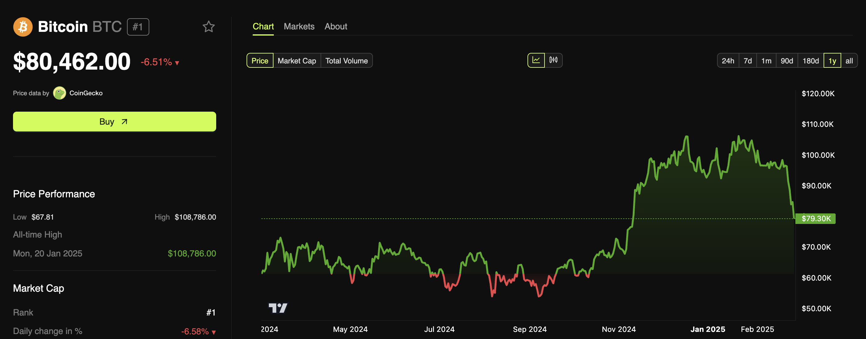 ในขณะที่เขียนข่าวนี้ Bitcoin กำลังซื้อขายที่ 80,462 USD หลังจาก ลดลง 6.5% ใน 24 ชั่วโมงที่ผ่านมา ตลาดคริปโตที่กว้างขึ้นก็ลดลงเช่นกัน โดยมีมูลค่าตลาดรวมลดลง 7.7%
