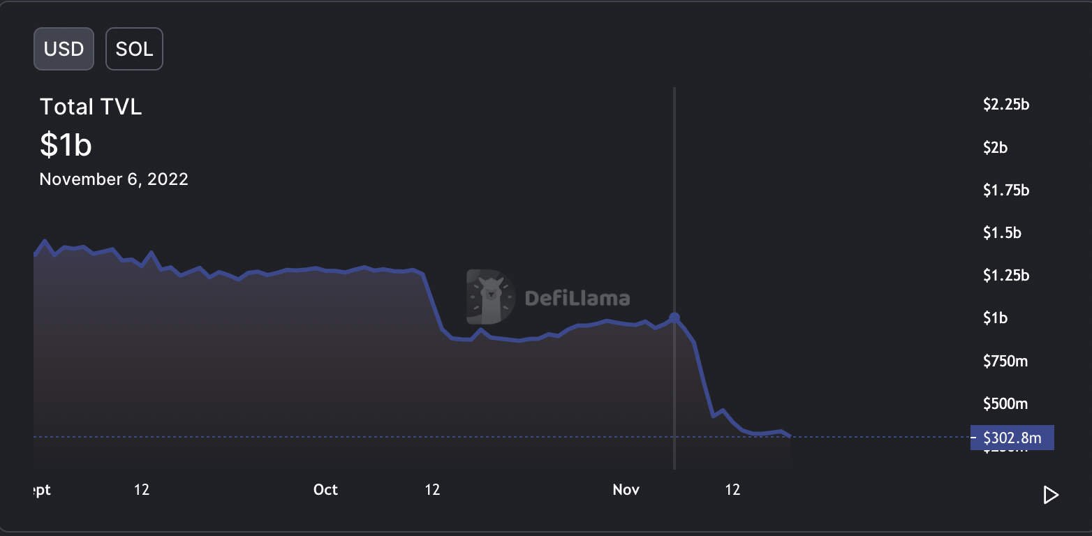 ไม่เพียงแค่ราคาของโทเค็น SOL ที่ได้รับผลกระทบ แต่ Total Value Locked (TVL) ในระบบนิเวศ Solana เองเช่นกัน ตามข้อมูลจาก DefiLlama TVL ลดลงเกือบ 70% ตั้งแต่วันที่ 6 พฤศจิกายน ระบบนิเวศ Solana มี TVL ที่ 1 พันล้านดอลลาร์ แต่เนื่องจากผลกระทบจาก FTX ทำให้ปัจจุบันมีมูลค่าเกือบ 300 ล้านดอลลาร์