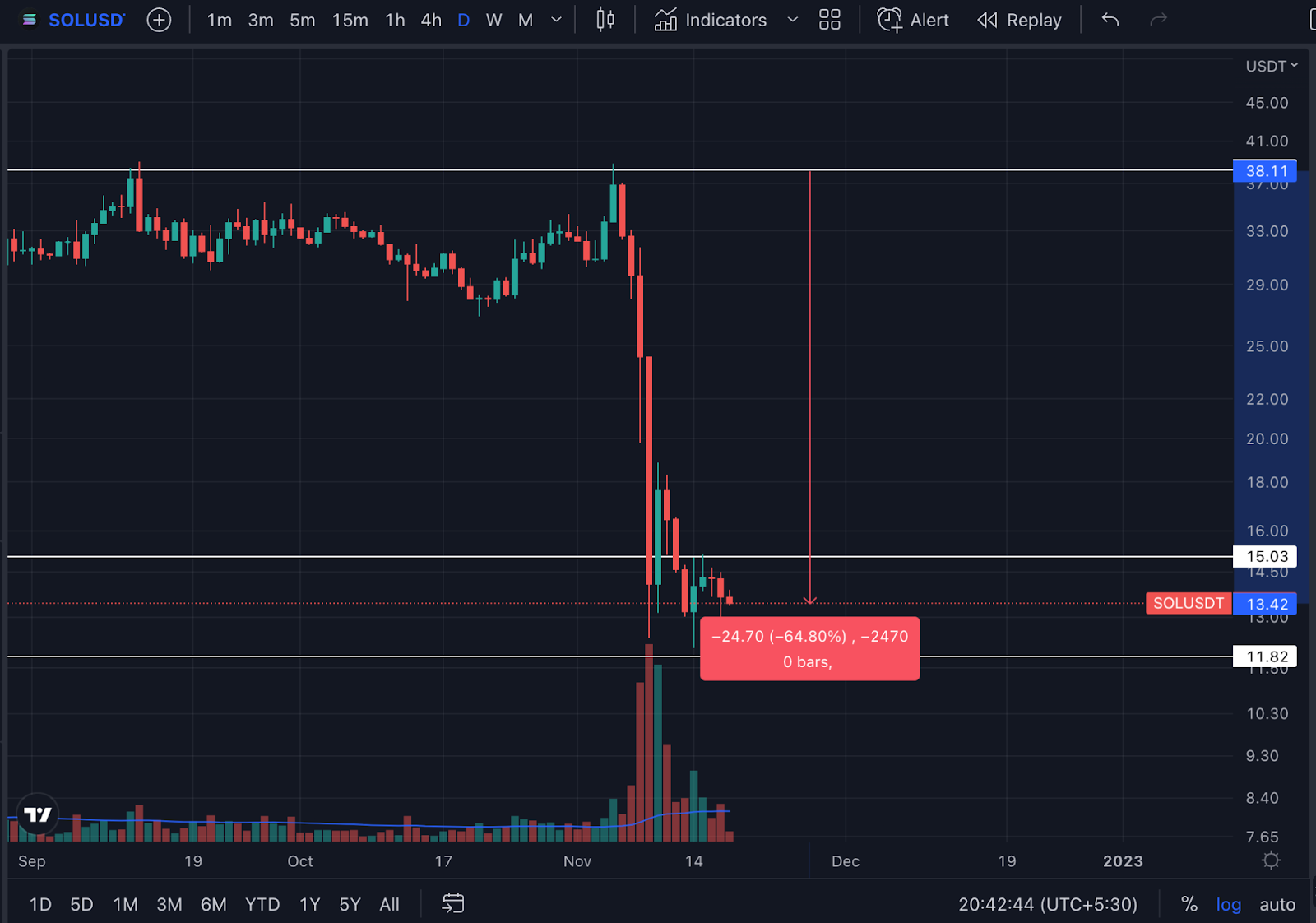 โทเค็นถูกปฏิเสธจากแนวต้านที่ 38.21 ดอลลาร์ในวันที่ 5 พ.ย. และตกต่ำอย่างต่อเนื่องตั้งแต่นั้นมา หลังจากลดลงเกือบ 65% SOL ซื้อขายระหว่าง $11.82 ถึง $15