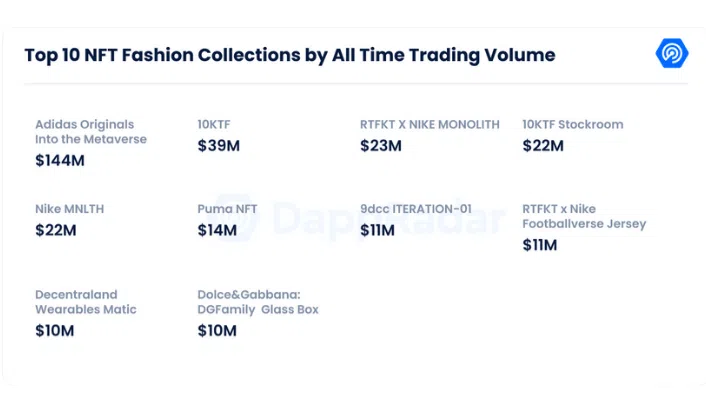 คอลเล็กชันยอดนิยม ได้แก่ Adidas Originals Into the Metaverse Nike MNLTH Decentraland Wearables Matic และ 10KTF นอกจากนี้ คอลเล็กชัน 10KTF คิดเป็น 74% ของปริมาณการซื้อขายสินค้าแฟชั่น NFT Yuga Labs เข้าซื้อคอลเลกชัน 10KTF ซึ่งเปิดตัวในปี 2021