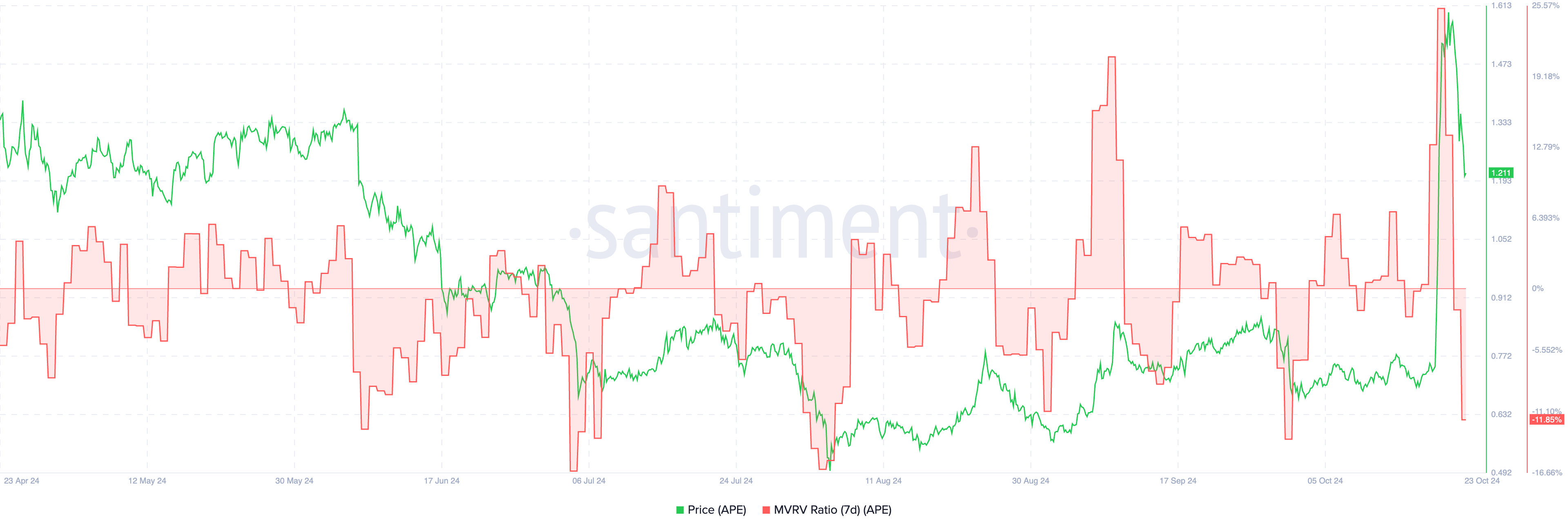 ราคา ApeCoin (APE) ลดลงประมาณ 15% ในช่วง 24 ชั่วโมงที่ผ่านมา หลังจากที่เพิ่มขึ้นมากกว่า 100% ระหว่างวันที่ 19 ถึง 21 ตุลาคม ตัวชี้วัด MVRV แสดงให้เห็นว่าผู้ถือหลายคนยังคงมีตำแหน่งขาดทุนที่ยังไม่ได้เกิดขึ้นจริง ซึ่งบ่งชี้ถึงความรู้สึกตลาดที่อ่อนแอ