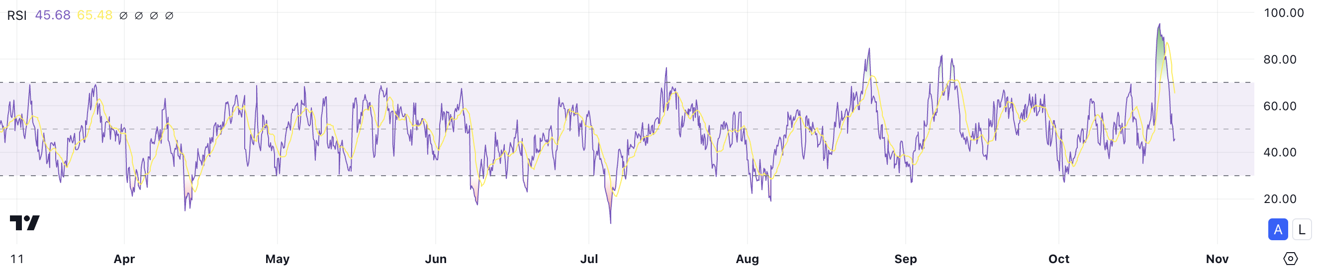 ค่า RSI มีช่วงตั้งแต่ 0 ถึง 100 โดยระดับที่สูงกว่า 70 มักบ่งชี้ถึงสภาวะซื้อมากเกินไป—แนะนำว่าสินทรัพย์อาจจะต้องมีการปรับตัวลดลง ในทางกลับกัน ค่าที่ต่ำกว่า 30 บ่งชี้ถึงสภาวะขายมากเกินไป ซึ่งบ่งบอกถึงโอกาสในการซื้อ