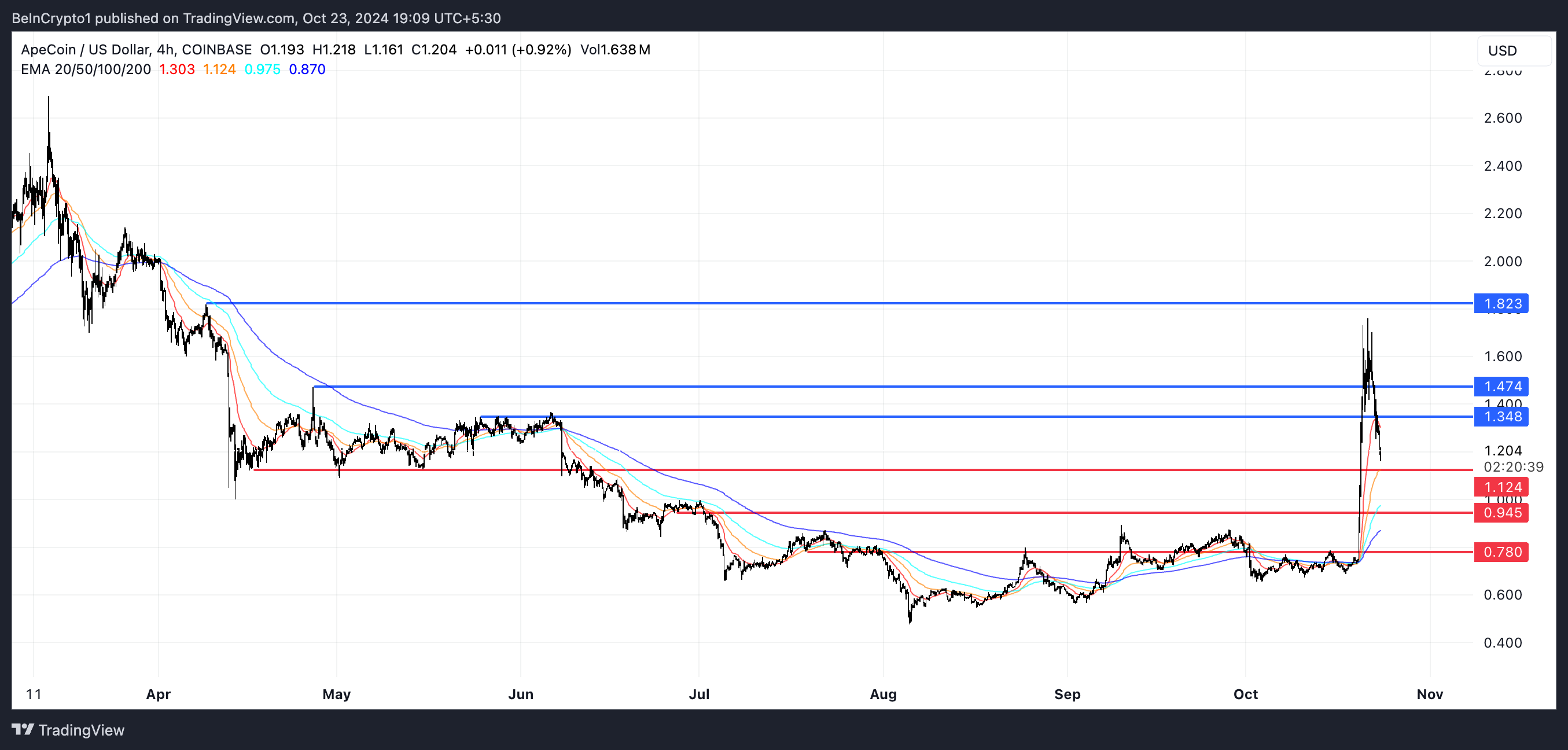 หาก APE ไม่สามารถรักษาการสนับสนุนที่ 1.12 USD ได้ การแก้ไขขาลงเพิ่มเติมไปที่ 0.94 USD หรือแม้กระทั่ง 0.78 USD ก็เป็นไปได้ ในทางกลับกัน หากเทรนด์ขาขึ้นปรากฏขึ้นอีกครั้ง ราคา APE อาจทดสอบการต้านทานที่ 1.34 USD และแม้กระทั่งลอง 1.47 USD หลังจากนั้น