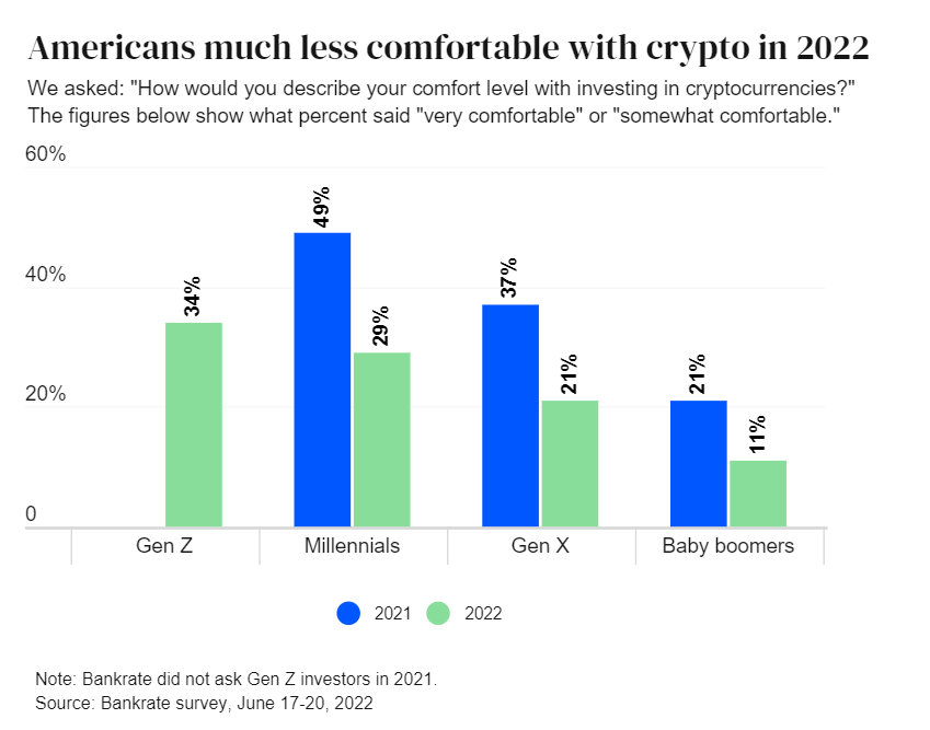 การวิเคราะห์ที่ดำเนินการโดยบริษัทผู้ให้บริการทางการเงิน Bankrate ระบุว่าคนรุ่นมิลเลนเนียลในสหรัฐฯ ไม่กระตือรือร้นเกี่ยวกับ cryptocurrencies เหมือนในปีที่แล้ว ประมาณ 30% กล่าวว่าพวกเขารู้สึกสบายใจที่จะลงทุนในสินทรัพย์ดิจิทัล เมื่อเทียบกับ 50% ในปี 2022 นับว่าเป็นความนิยมที่ถดถอย แน่นอนว่ามันเป็นผลกระทบจากตลาดขาลงในช่วง 9 เดือนที่ผ่านมา