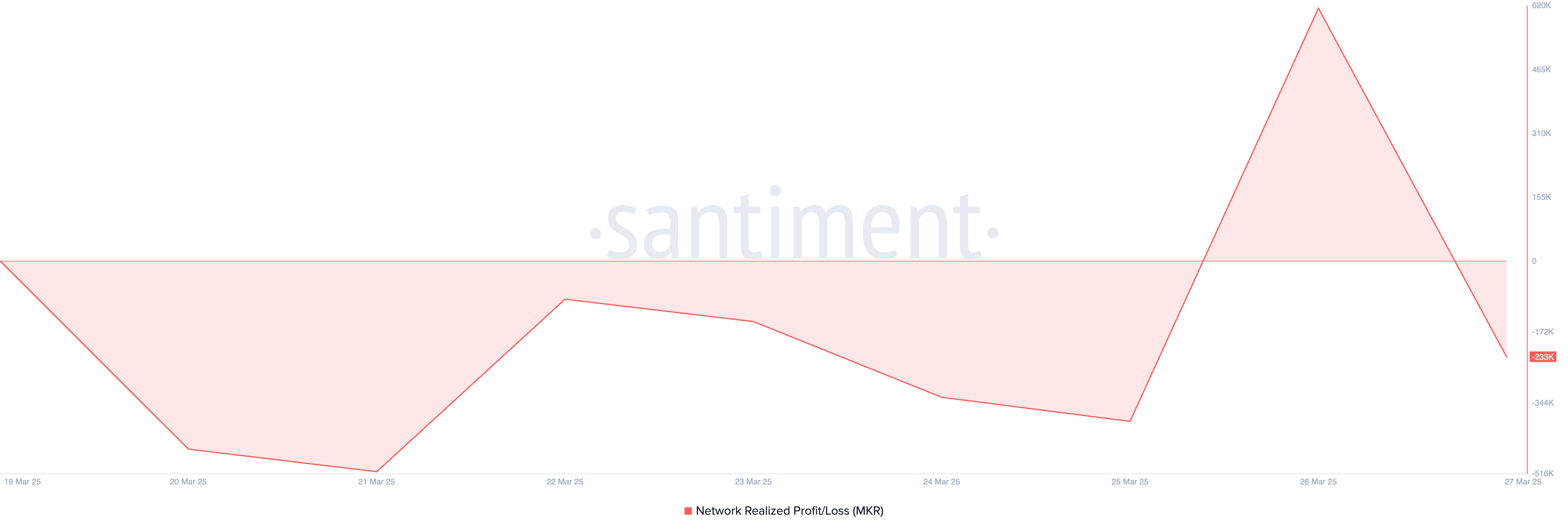 นอกจากนี้ กำไร/ขาดทุนที่รับรู้ของเครือข่าย (NPL) ของโทเค็นได้กลายเป็นลบ ซึ่งบ่งบอกว่าผู้ถือครองมีแรงจูงใจน้อยลงในการขายในระดับราคาปัจจุบันเนื่องจากพวกเขาถือครองในขาดทุน ในขณะที่เขียน NPL ของ MKR อยู่ในแนวโน้มขาลง ที่ -233,000