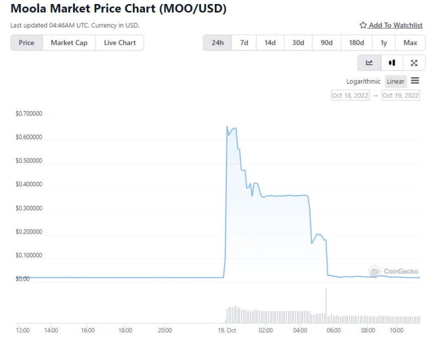 ราคา MOO กลับสู่ระดับก่อนการโจมตีประมาณ 0.018 ดอลลาร์สหรัฐ โดยสูญเสียมูลค่า 99% นับตั้งแต่ราคาสูงสุดในเดือนกันยายน 2021 ที่ราคาสูงกว่า 3 ดอลลาร์สหรัฐ