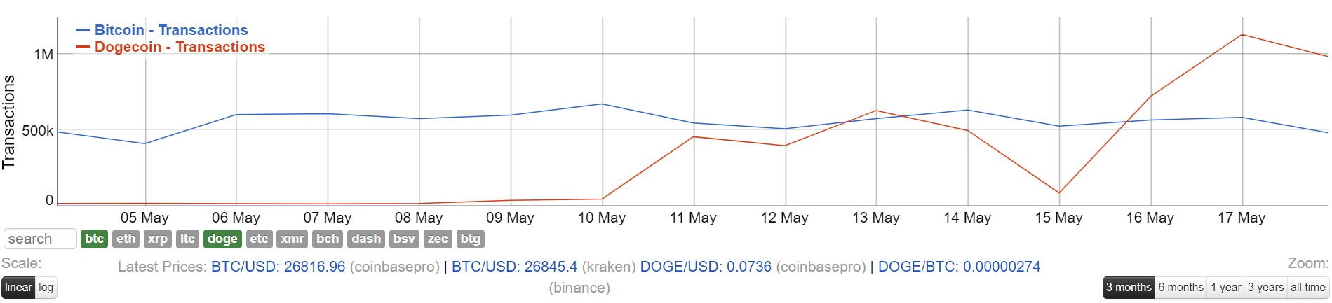 BitInfoCharts เปิดเผยจำนวนการทำธุรกรรมบนเครือข่าย DOGE แซงหน้า Bitcoin หลังการเปิดตัว DRC-20