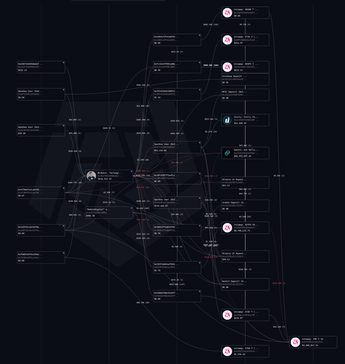 ส่วนสำคัญของการดำเนินการของเขาคือเครือข่ายกระเป๋าเงินลับที่กว้างขวาง วิธีนี้เคยถูกใช้ในอดีตอย่างแพร่หลาย ช่วยให้ผู้ใช้สามารถปั๊มสินทรัพย์ที่พวกเขาถืออยู่อย่างลับๆ MrBeast เปิดเผยที่อยู่กระเป๋าเงินหลักของเขาเองผ่านโพสต์โซเชียลมีเดียในปี 2021 นักสืบใช้ข้อมูลนี้และข้อมูลบน Chain เพื่อแผนที่เครือข่ายที่กว้างขึ้นของเขา เผยการลงทุนที่ซ่อนอยู่มากมาย