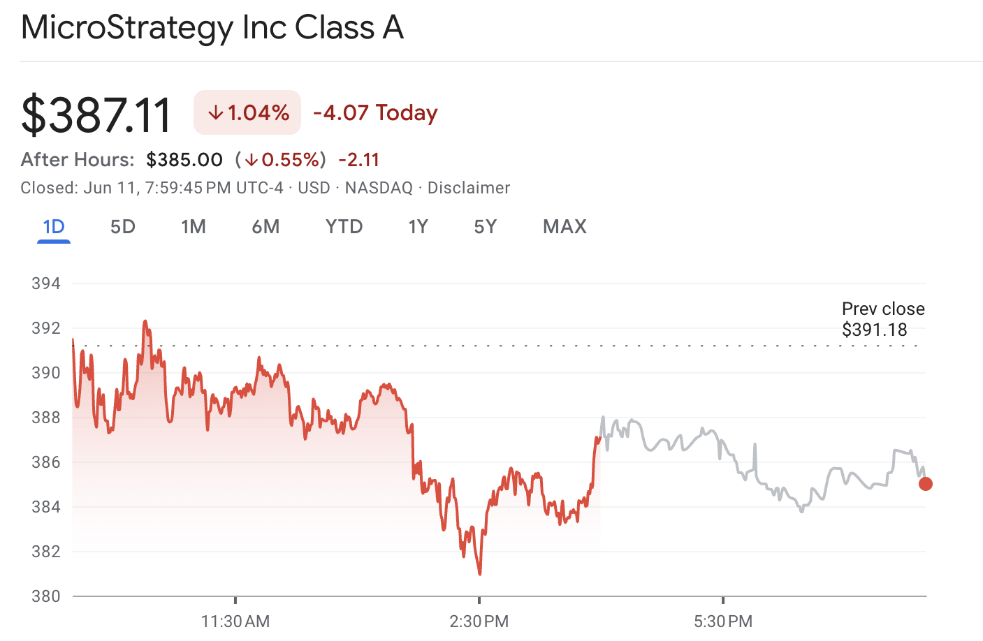 ตอนนี้ ไม่ว่าราคาหุ้น MSTR จะเพิ่มขึ้นหรือไม่ยังคงต้องรอดู จากข้อมูลล่าสุดของ Google Finance หุ้นปิดที่ 387.1 USD ลดลง 1.04%