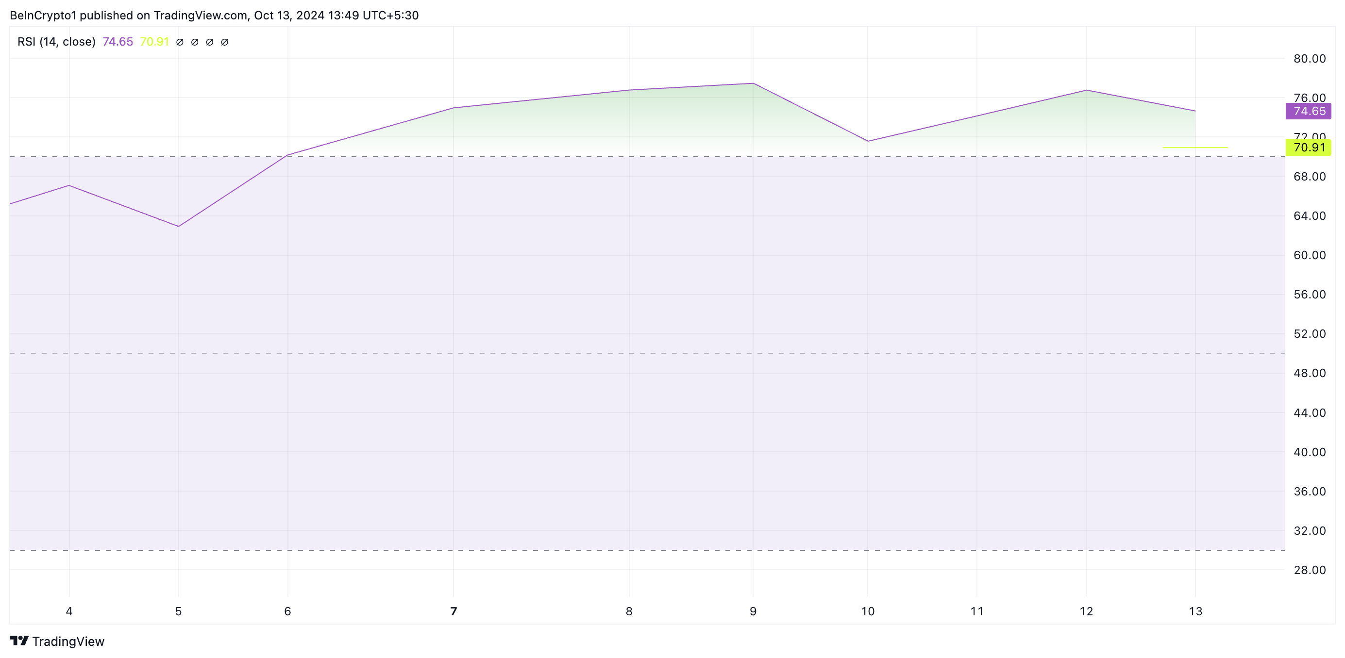 ดัชนีความแข็งแกร่งสัมพัทธ์ RSI ของ NEIRO ที่ประเมินจากแผนภูมิหนึ่งวันอยู่ที่ 74.65 ซึ่งบ่งชี้ว่าตลาดมีความร้อนแรงเกินไปและควรมีการปรับตัว ตัวชี้วัดนี้วัดสภาวะตลาดที่ขายมากเกินไปและซื้อมากเกินไป