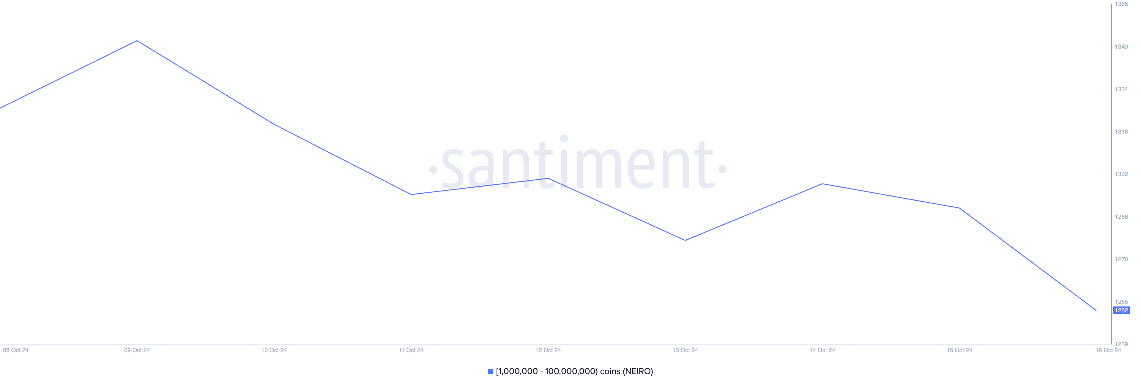 การลดลงของการถือครอง NEIRO ในหมู่วาฬ หรือนักลงทุนขนาดใหญ่ ยังเสริมมุมมองที่เชื่อว่าราคาจะลดลง ในสัปดาห์ที่ผ่านมา วาฬ NEIRO ที่ถือระหว่าง 1 ล้านถึง 100 ล้านโทเค็นได้ลดการเปิดเผยของพวกเขาอย่างต่อเนื่อง