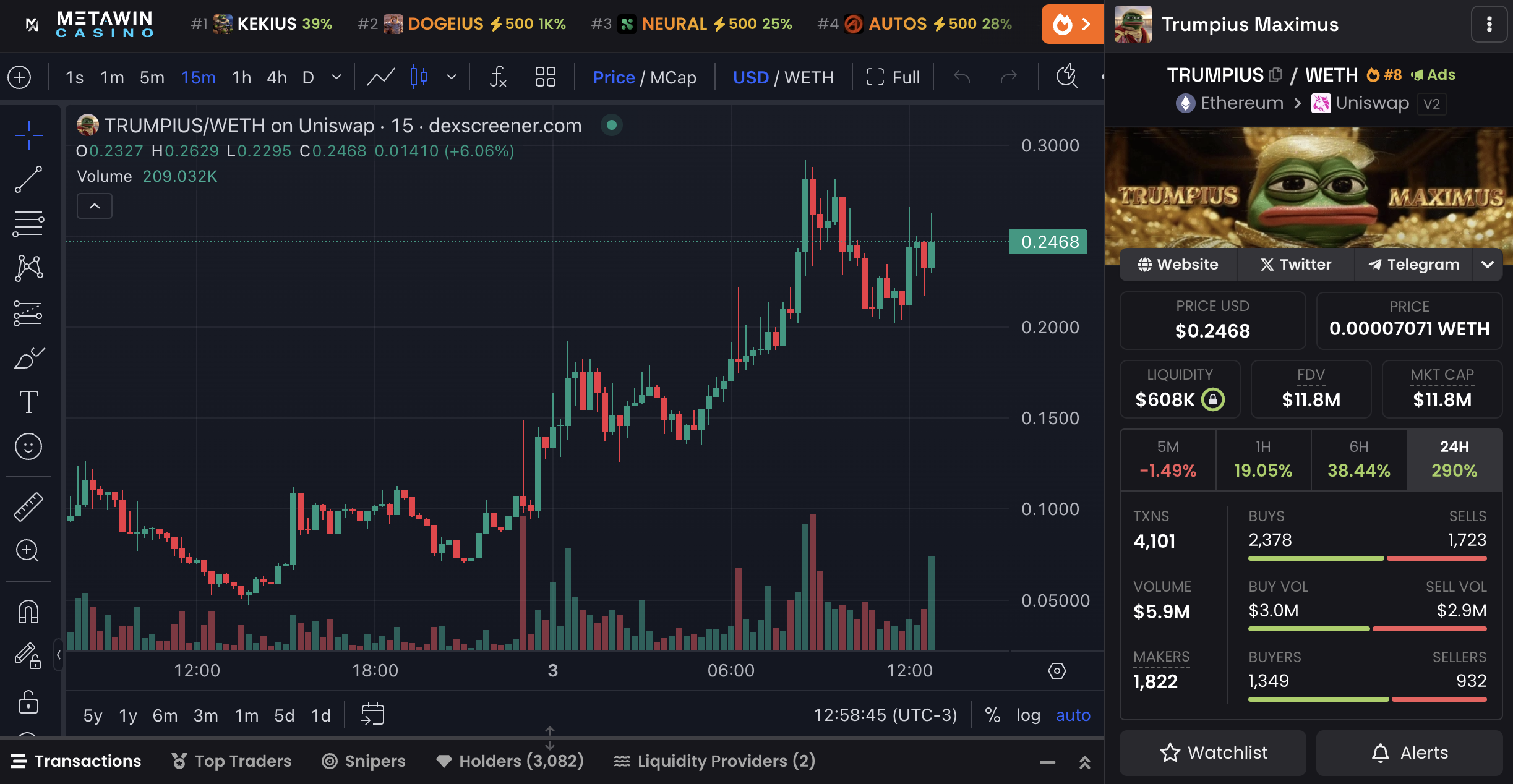 TRUMPIUS, memecoin ที่เปิดตัวบน Ethereum มุ่งหวังที่จะใช้ประโยชน์จากความนิยมของโทเค็นธีมกบและ meme ที่เกี่ยวข้องกับ Trump ในเวลาเพียงสองวันครึ่ง มันได้ดึงดูดผู้ถือกว่า 3,000 ราย และมีปริมาณการซื้อขายรายวัน 6 ล้าน USD