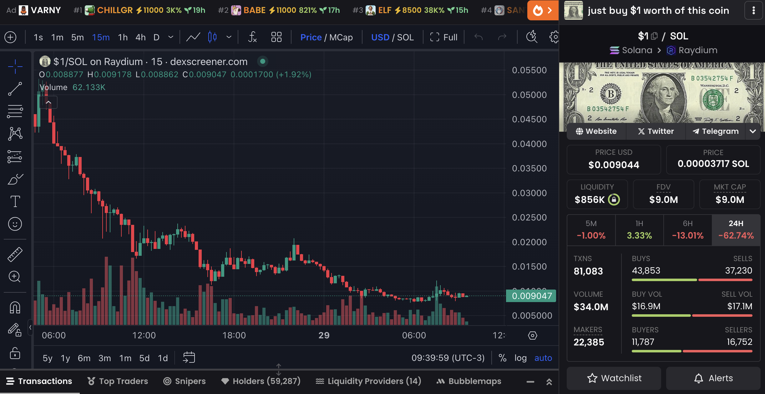 coin $1 ที่เปิดตัวบน Solana เมื่อห้าวันที่แล้ว ได้รับความสนใจอย่างรวดเร็ว ดึงดูดผู้ถือครองเกือบ 60,000 รายและบันทึกธุรกรรม 81,000 รายการใน 24 ชั่วโมงที่ผ่านมา