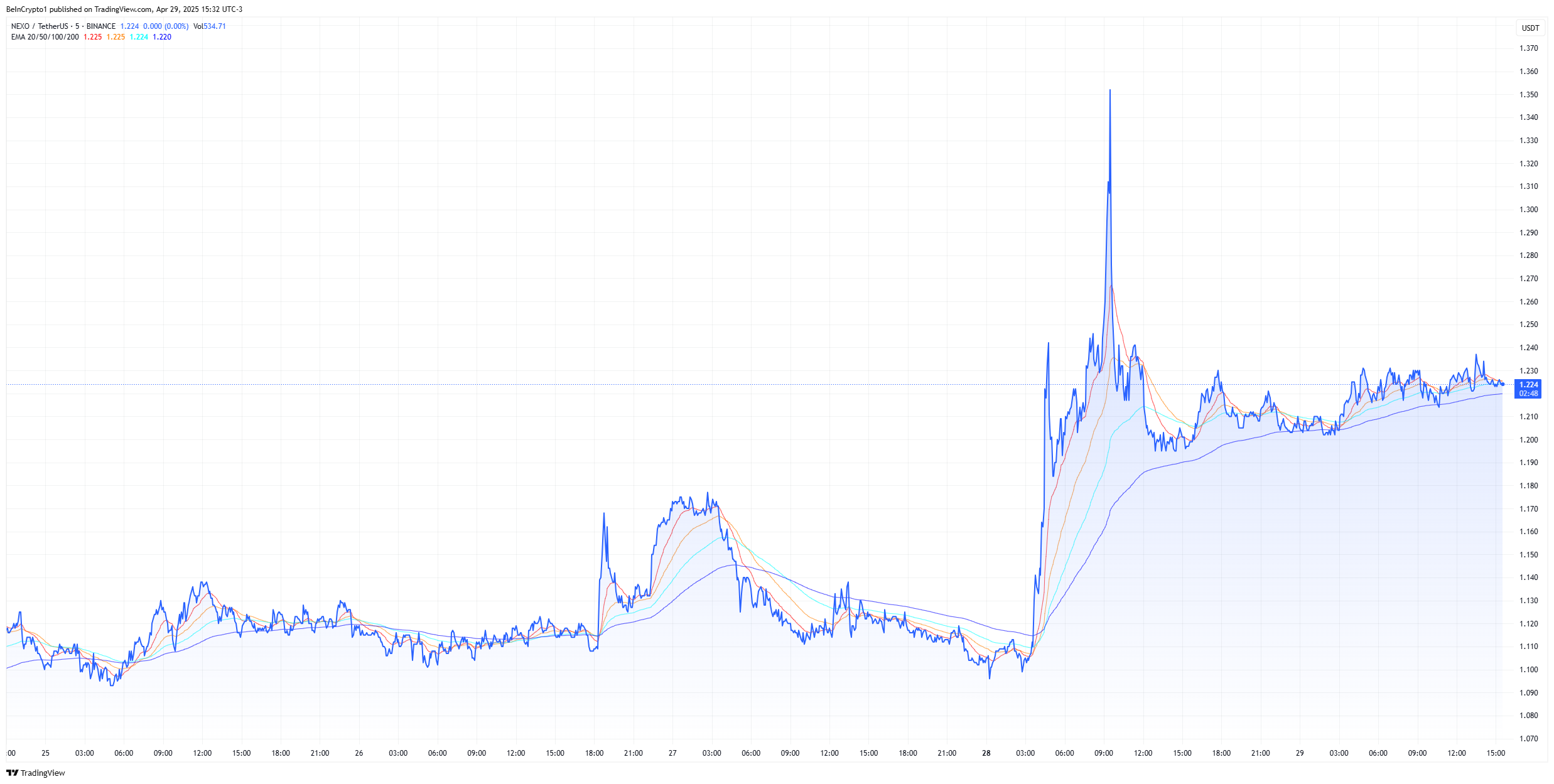 ในสัปดาห์ที่ผ่านมา โทเค็นพื้นเมืองของเครือข่าย NEXO เพิ่มขึ้นมากกว่า 12% และความรู้สึกเชิงบวกยังคงดำเนินต่อไปในวันนี้หลังจากข่าว มูลค่าตลาดของมันอยู่ที่ 1.2 พันล้าน USD
