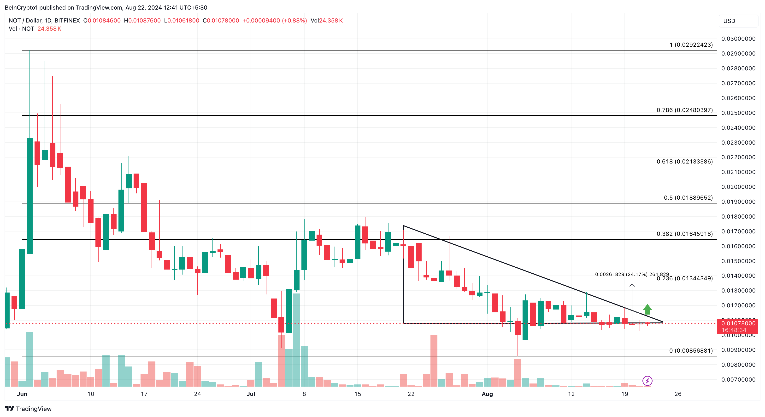 ณ เวลาที่กด กราฟ NOT/USD แสดงรูปสามเหลี่ยมจากมากไปหาน้อย ซึ่งเป็นรูปแบบที่โดยทั่วไปจะส่งสัญญาณถึงความต่อเนื่องของขาลง อย่างไรก็ตาม ในบางกรณี การกลับตัวอาจเกิดขึ้นได้ และ Notcoin ดูเหมือนจะเป็นหนึ่งในข้อยกเว้นเหล่านั้น