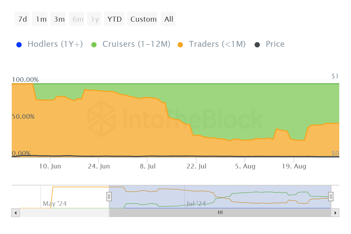 หนึ่งในภัยคุกคามที่ใหญ่ที่สุดต่อราคาของ Notcoin ในขณะนี้ คือการครอบงำของผู้ถือระยะสั้น (STH) ผู้ลงทุนเหล่านี้ควบคุม 46% ของปริมาณที่หมุนเวียนและมีแนวโน้มที่จะขาย เนื่องจากพวกเขามักถือสินทรัพย์น้อยกว่าหนึ่งเดือน