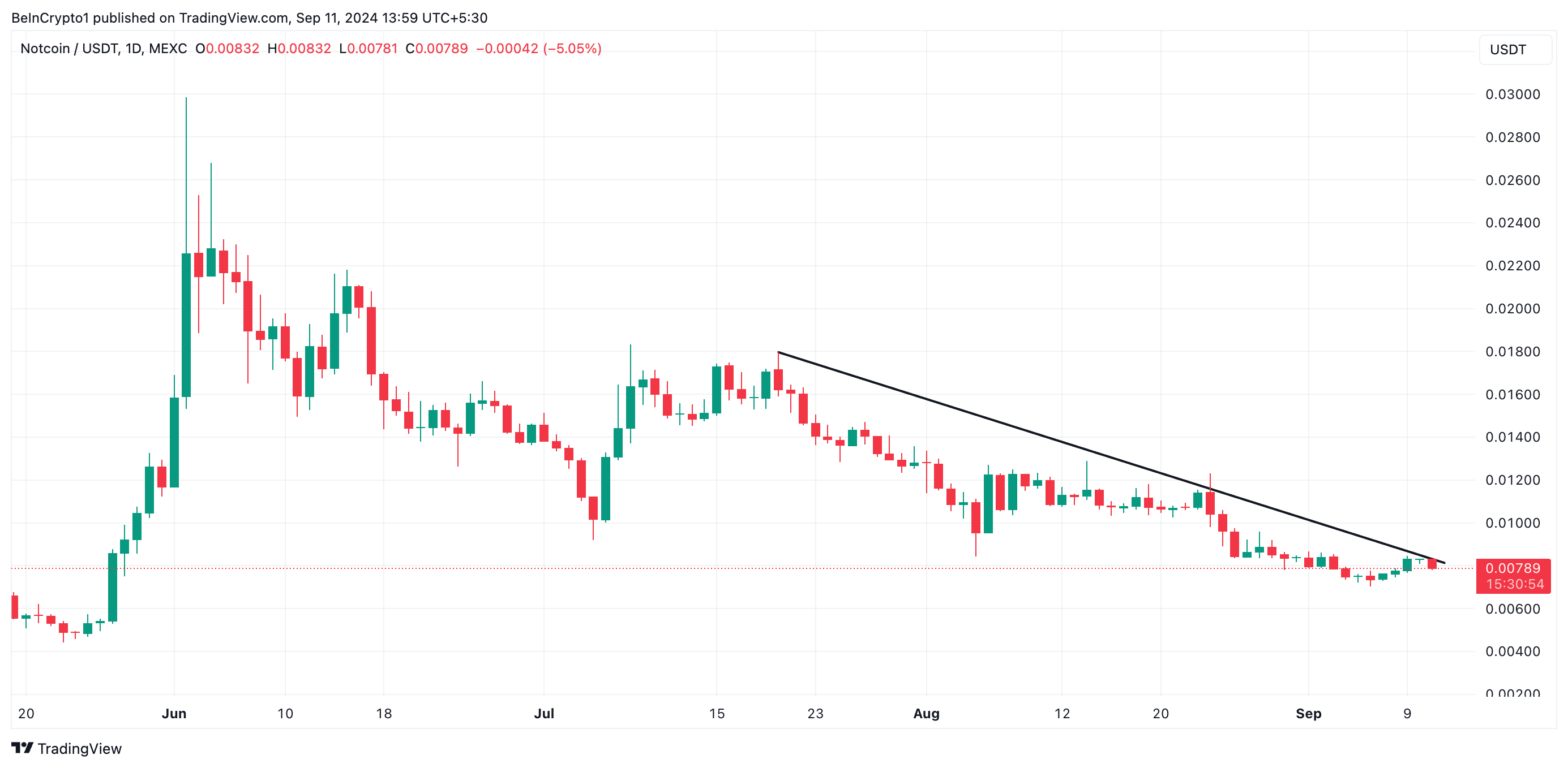 การวิเคราะห์กราฟรายวันของ Notcoin จาก BeinCrypto เผยให้เห็นว่าสินทรัพย์นี้เคลื่อนไหวภายใต้เส้นต้านทานแนวโน้มลงตั้งแต่วันที่ 20 กรกฎาคม รูปแบบนี้บ่งชี้ถึงแนวโน้มขาลง ซึ่งแนะนำถึงการลดลงอย่างค่อยเป็นค่อยไปของราคาสินทรัพย์