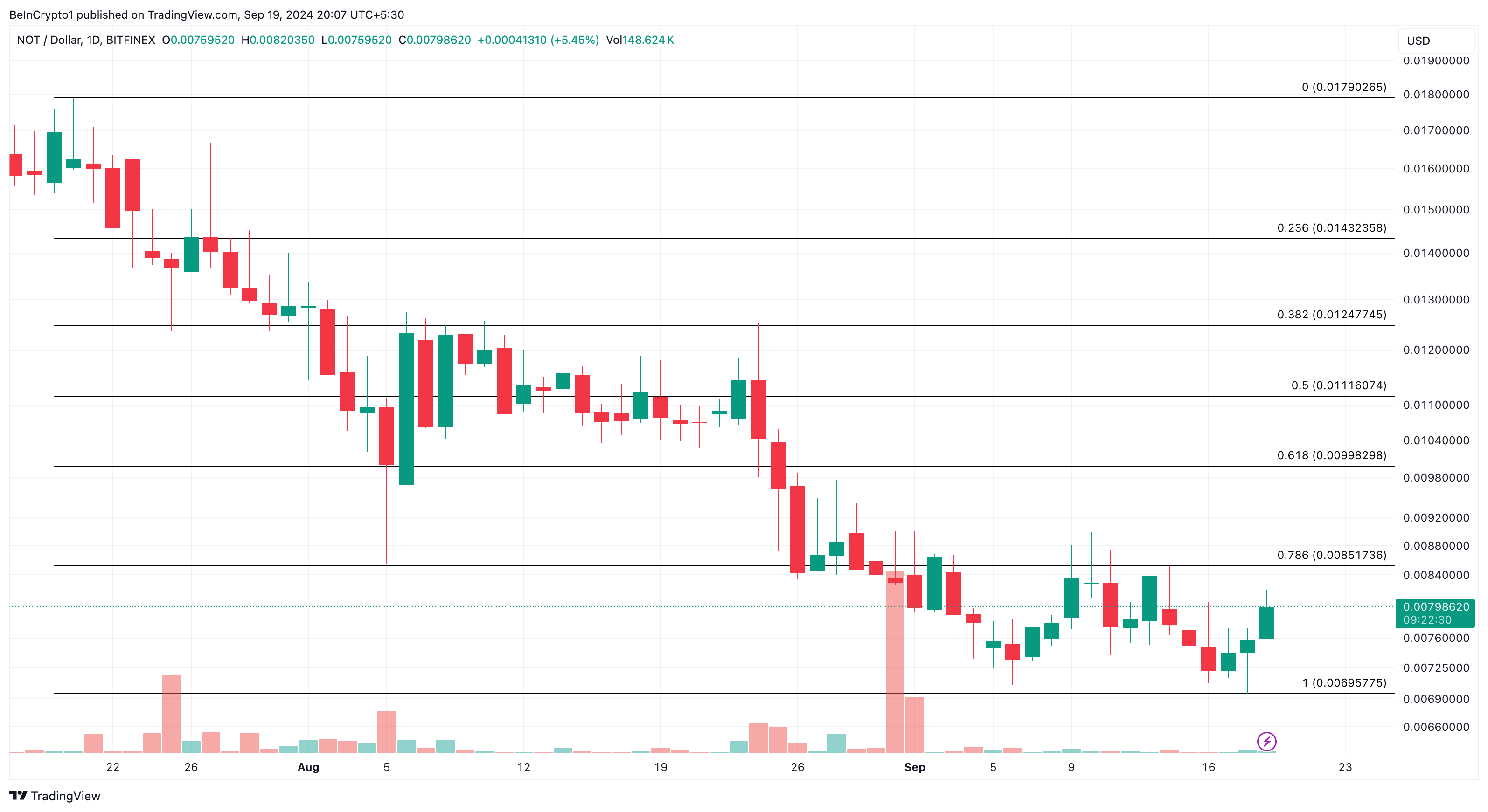 นอกจากนี้ ตัวบ่งชี้การถอยร่นของฟีโบนักชีก็ให้ข้อมูลเชิงลึกเกี่ยวกับการเคลื่อนไหวต่อไปของ NOT จากมุมมองระยะสั้น กระทิงอาจพยายามทะลุผ่านระดับ 0.0085 ดอลลาร์อย่างไรก็ตาม ในพื้นที่เดียวกันนั้น Notcoin เริ่มมีการลดลง ที่ทำให้ราคาตกลงไปที่ 0.0072 ดอลลาร์ เมื่อวันที่ 6 กันยายน