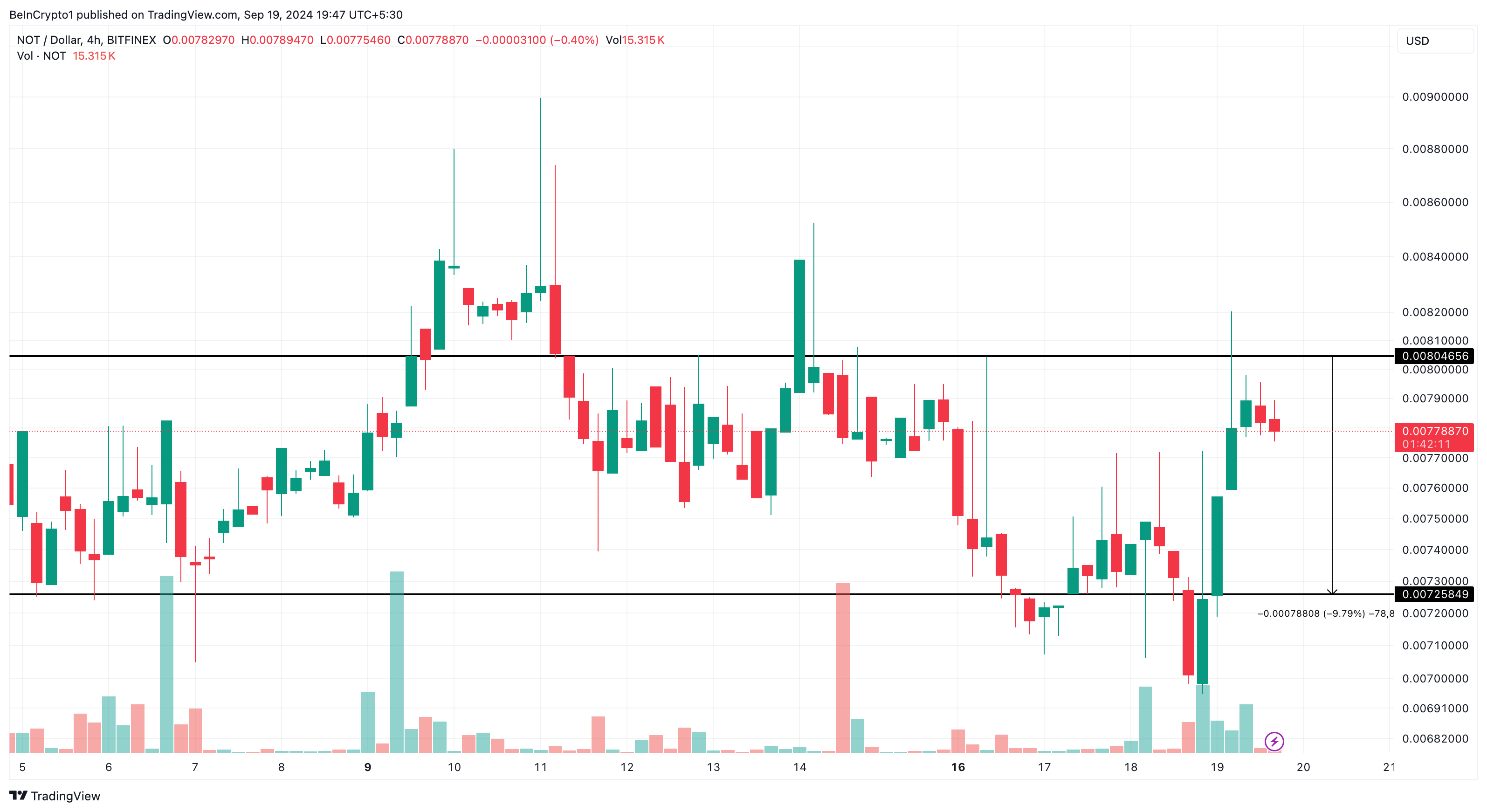 แผนภูมิ 4 ชั่วโมงแสดงให้เห็นว่า Notcoin กำลังก้าวไป ที่ 0.0080 ดอลลาร์ แต่ระดับนี้เคยเป็นจุดต้านที่เหรียญเผชิญกับการปฏิเสธ หาก Notcoin ไม่สามารถทะลุผ่านระดับราคานี้ได้มันอาจเห็นการแก้ไข 10% ในกรณีนี้, มูลค่าของมันอาจลดลงเป็น 0.0072 ดอลลาร์