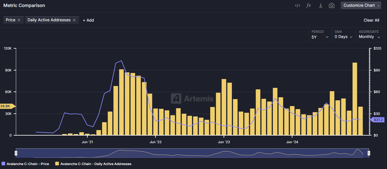 อย่างไรก็ตาม Avalanche เผชิญกับความขัดแย้ง กิจกรรมบนเครือข่ายดูเหมือนจะไม่สอดคล้องกับความรู้สึกของตลาด AVAX โทเค็นยังคงมีราคาประมาณ 21 USD ซึ่งต่ำกว่าจุดสูงสุดปลายปี 2024 กว่า 60%