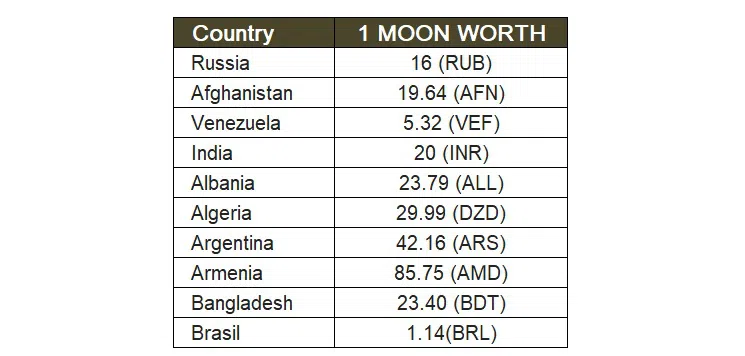เพื่อเป็นการเจาะจง 1 MOON มีค่า 42.16 เปโซอาร์เจนตินา 1.14 เรียลบราซิล 1.5 หยวนจีน 125.98 โกลองคอสตาริกาและ 6.73 ปอนด์อียิปต์ มูลค่าของสกุลเงินดิจิทัล Moons เป็นข้อพิสูจน์ว่าสกุลเงินดิจิทัลมีศักยภาพที่แข็งแกร่งในการที่จะกลายเป็นสินทรัพย์จริง