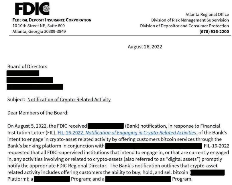 รายงานปี 2023 จากสำนักงานผู้ตรวจการทั่วไปของ FDIC เปิดเผยว่าระหว่างเดือนมีนาคม 2022 ถึงพฤษภาคม 2023 หน่วยงานได้ส่ง “จดหมายหยุด” ไปยังธนาคารหลายแห่ง จดหมายเหล่านี้ขอให้ธนาคารหยุดกิจกรรมที่เกี่ยวข้องกับคริปโตในขณะที่ให้ข้อมูลเพิ่มเติมเพื่อการตรวจสอบ