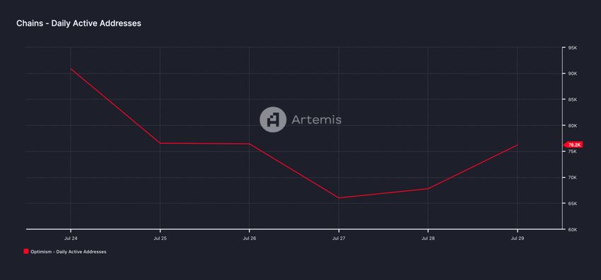 ปริมาณ DEX ของ Optimism ที่ลดลงในสัปดาห์ที่ผ่านมาสะท้อนให้เห็นถึงการลดลงของกิจกรรมของผู้ใช้บนเครือข่ายในช่วงเวลาเดียวกัน จากข้อมูลของ Artemis จํานวนกระเป๋าเงินบนเครือข่ายที่ไม่ซ้ํากันรายวันทั้งหมดที่โต้ตอบกับเครือข่ายลดลง 16% ในช่วงเจ็ดวันที่ผ่านมา