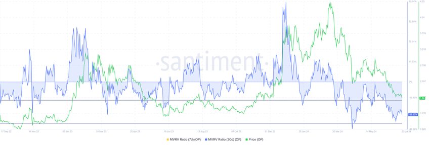 นอกจากนี้ อัตราส่วน Market Value to Realized Value MVRV ยังสนับสนุนผลลัพธ์ที่เป็นกระทิง อัตราส่วน MVRV ประเมินกำไรและขาดทุนของนักลงทุนปัจจุบัน MVRV 30 วันของ Optimism อยู่ที่ -28% ซึ่งบ่งชี้ถึงการขาดทุน ซึ่งอาจนำไปสู่แรงกดซื้อ