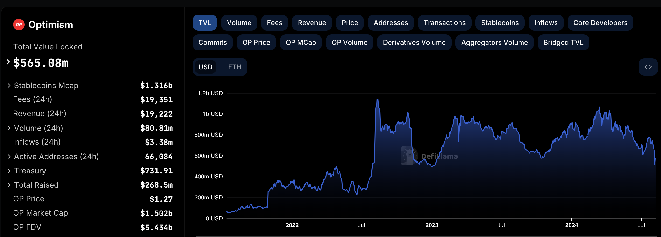 อย่างไรก็ตาม สกุลเงินดิจิทัลดั้งเดิมไม่ใช่ส่วนเดียวของระบบนิเวศของ Optimism ที่ประสบปัญหา จากข้อมูลของ DeFiLlama มูลค่ารวมที่ถูกล็อค (TVL) ของ Optimism ลดลงเหลือ 565.08 ล้านดอลลาร์ ซึ่งเป็นมูลค่าที่เข้าถึงได้ครั้งล่าสุดในเดือนมกราคม 2023 เมตริกเดียวกันนี้มีมูลค่ามากกว่า 1 พันล้านดอลลาร์เมื่อราคา OP แตะระดับสูงสุดเป็นประวัติการณ์