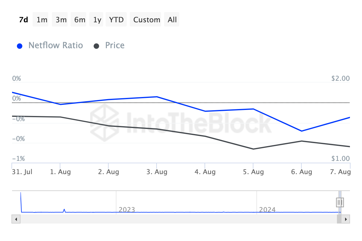 ผลที่ตามมาคือการเพิ่มขึ้น 51% เป็น 1.99 ดอลลาร์ในเดือนกรกฎาคม อย่างไรก็ตาม ณ เวลาที่พิมพ์ โทเค็นได้สูญเสียกําไรเหล่านั้นไปทั้งหมด นอกจากนี้ Chaikin Money Flow (CMF) ซึ่งวัดการสะสมและการกระจายได้ลดลงสู่บริเวณติดลบ