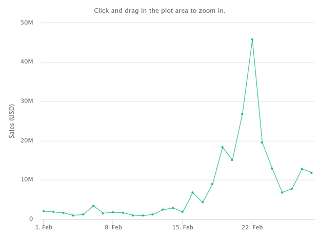 Sponsoredในช่วงเดือนนี้มี ผู้ซื้อที่ไม่ซ้ำกันอยู่ 82,822 รายและมีธุรกรรมรวมกันเกินหนึ่งล้านรายการเป็นครั้งแรก ราคาขายโดยเฉลี่ยทะลุ 100 ดอลลาร์เป็นครั้งแรกของสถิติราคาขายสูงสุดตลอดกาลใหม่ที่ 181.81 ดอลลาร์