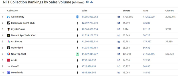 NFT ที่เป็นการแสดงช่วงเวลาที่ดีที่สุดของ National Basketball Association (NBA) มียอดขายรวม 1.027 พันล้านดอลลาร์ จากข้อมูลของ CryptoSlam