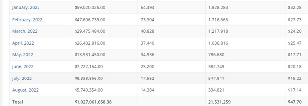 เดือนอื่นๆ ที่มีส่วนสำคัญ ได้แก่ เดือนมีนาคม (208 ล้านดอลลาร์) และเดือนเมษายน 2021 (82 ล้านดอลลาร์) และเดือนมกราคม 2022 (59 ล้านดอลลาร์) หลังจากจุดสูงสุดใหม่ เทรนด์ขาลงที่เริ่มหยั่งรากลึกในเดือนธันวาคมได้เข้ายึดมามีอิทธิพลต่อตลาดในช่วงครึ่งแรกของปี และสิ่งนี้เป็นเหตุผลของยอดขายที่ดิ่งลงเหว