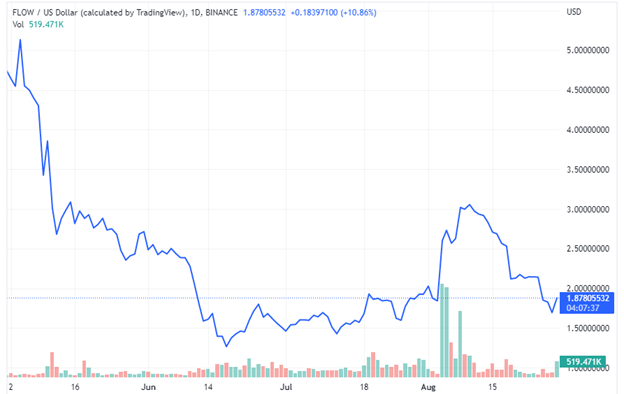 FLOW เปิดราคาซื้อขายในวันแรกของเดือนพฤษภาคมที่ราคา 4.49 ดอลลาร์ แตะระดับสูงสุดที่ราคา 5.20 ดอลลาร์เมื่อวันที่ 5 พฤษภาคม ทดสอบระดับต่ำสุดที่ราคา 1.17 ดอลลาร์เมื่อวันที่ 18 มิถุนายน และซื้อขายกันที่ราคา 1.89 ดอลลาร์เมื่อวันที่ 29 สิงหาคม FLOW มีราคาลดลง 57% ภายในช่วง 4 เดือน