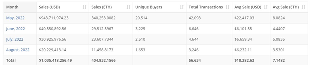 เดือนสิงหาคมได้พิสูจน์แล้วว่ามันเป็นเดือนที่ยากลำบากสำหรับภาคส่วนของสะสมดิจิทัล เนื่องจากผู้ซื้อที่ไม่ซ้ำกัน (Unique Buyer) และธุรกรรมทั้งหมดยังคงต่ำกว่าตัวชี้วัดในช่วงเดือนแรกๆ ของปี