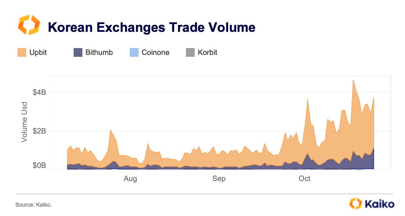 นอกจากนี้ ข้อมูลจาก Kaiko ระบุว่าปริมาณการซื้อขายสกุลเงินดิจิทัลบน แพลตฟอร์มแลกเปลี่ยน ของเกาหลีใต้พุ่งสูงขึ้นในเดือนพฤศจิกายน โดยส่วนใหญ่ของกิจกรรมมุ่งเน้นที่ Upbit ส่วนแบ่งตลาดของ Upbit พุ่งขึ้นจาก 43% เป็นเกือบ 90% ระหว่างเดือนกันยายน 2020 ถึงพฤษภาคม 2021 และยังคงรักษาระดับสูงตั้งแต่นั้นมา Altcoins คิดเป็น 88% ของกิจกรรมการซื้อขายบน Upbit