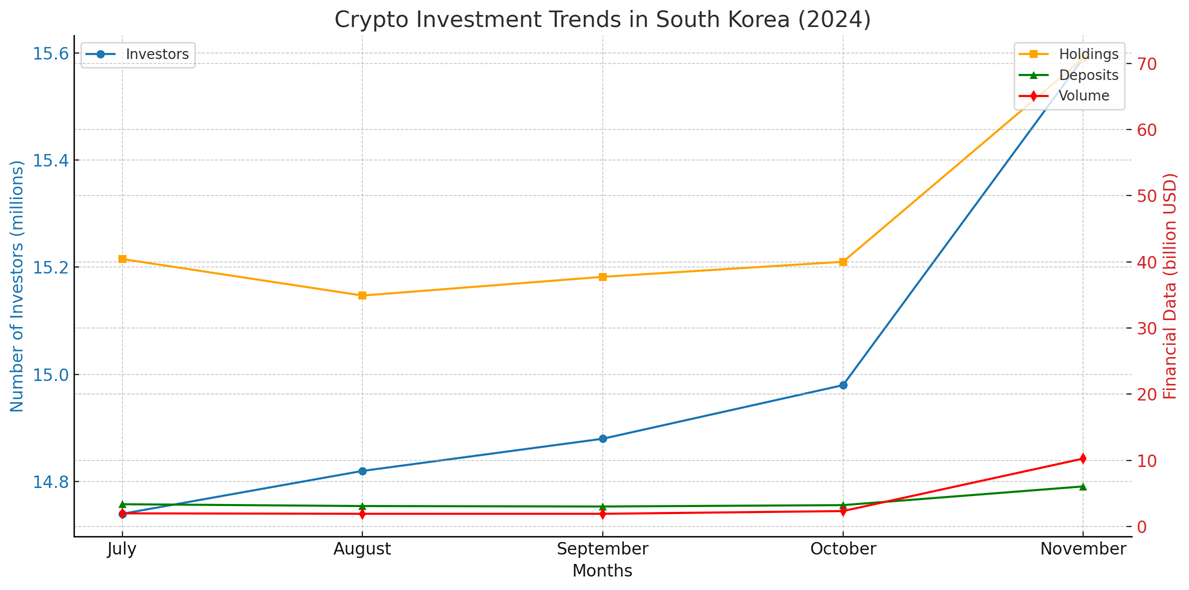 จำนวนผู้ลงทุนในสินทรัพย์ดิจิทัลในเกาหลีใต้เพิ่มขึ้นอย่างมากในช่วงปลายปี 2024 เป็นครั้งแรกที่เกาหลีใต้รวบรวมสถิติอย่างละเอียดจากห้าแพลตฟอร์มแลกเปลี่ยนสกุลเงินดิจิทัลหลัก (Upbit, Bithumb, Coinone, Korbit, และ Gopax)