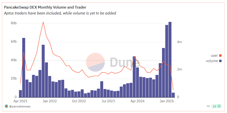 PancakeSwap ซึ่งเป็นการแลกเปลี่ยนแบบกระจายศูนย์ (DEX) ชั้นนำที่ดำเนินการบนเครือข่ายบล็อกเชนเก้าแห่ง ได้สร้างสถิติใหม่สำหรับกิจกรรมการซื้อขายในเดือนมกราคมและกุมภาพันธ์ 2025 โดยมีปริมาณการซื้อขายรายเดือนสูงสุดตั้งแต่ปี 2021